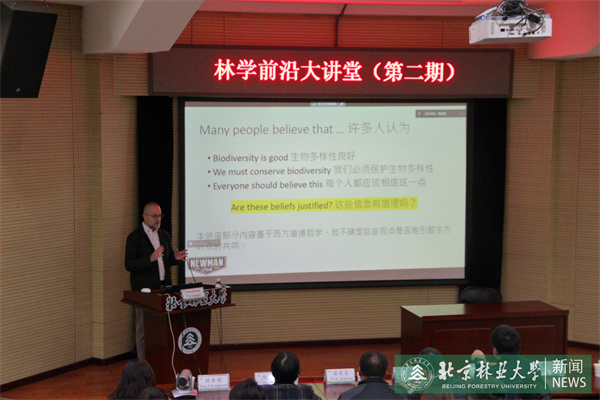 Jonathan Newman教授從人類對地球生物承擔的道德和管理責任、生物多樣性具有的審美價值、生物多樣性為人類帶來的經濟價值及生物多樣性的生態服務功能四個角度,論述了保護生物多樣性的必要性。報告討論了道德責任與環境保護的關系,強調了理論變革在生物多樣性保護中的重要作用。