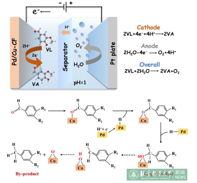 日前,材料學院和理學院課題組合作在林木生物質衍生物電化學催化加氫領域取得新進展。苯甲醛類和糠醛類物質分別是林木生物質木質素和綜纖維素組分的主要衍生物,作為原料可以生產多種高附加值的精細化學品和活性物質,用于替代石化資源生產生物基材料和生物化工產品。與傳統化學加氫還原方法相比,電化學還原方法以水作為氫源,具有反應條件溫和、過程可控性好和能耗較低等優勢。新型高效率催化劑的制備和反應體系的設計是實現林木衍生物電化學高效轉化的關鍵。