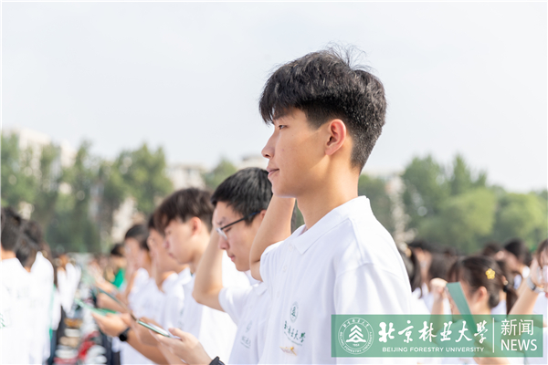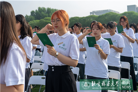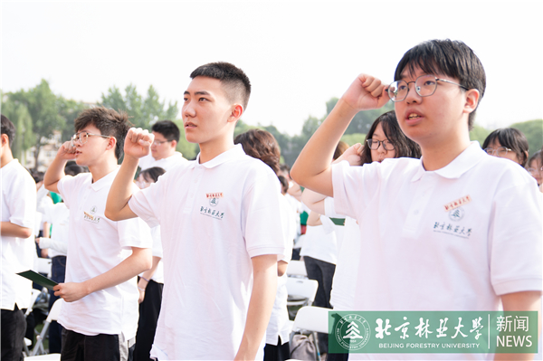校領導為新生代表佩戴校徽。全體新生起立,集體佩戴校徽。校徽是我校的標識,更是一種傳承和責任。戴上校徽的這一刻,他們成為了北京林業大學的一份子。