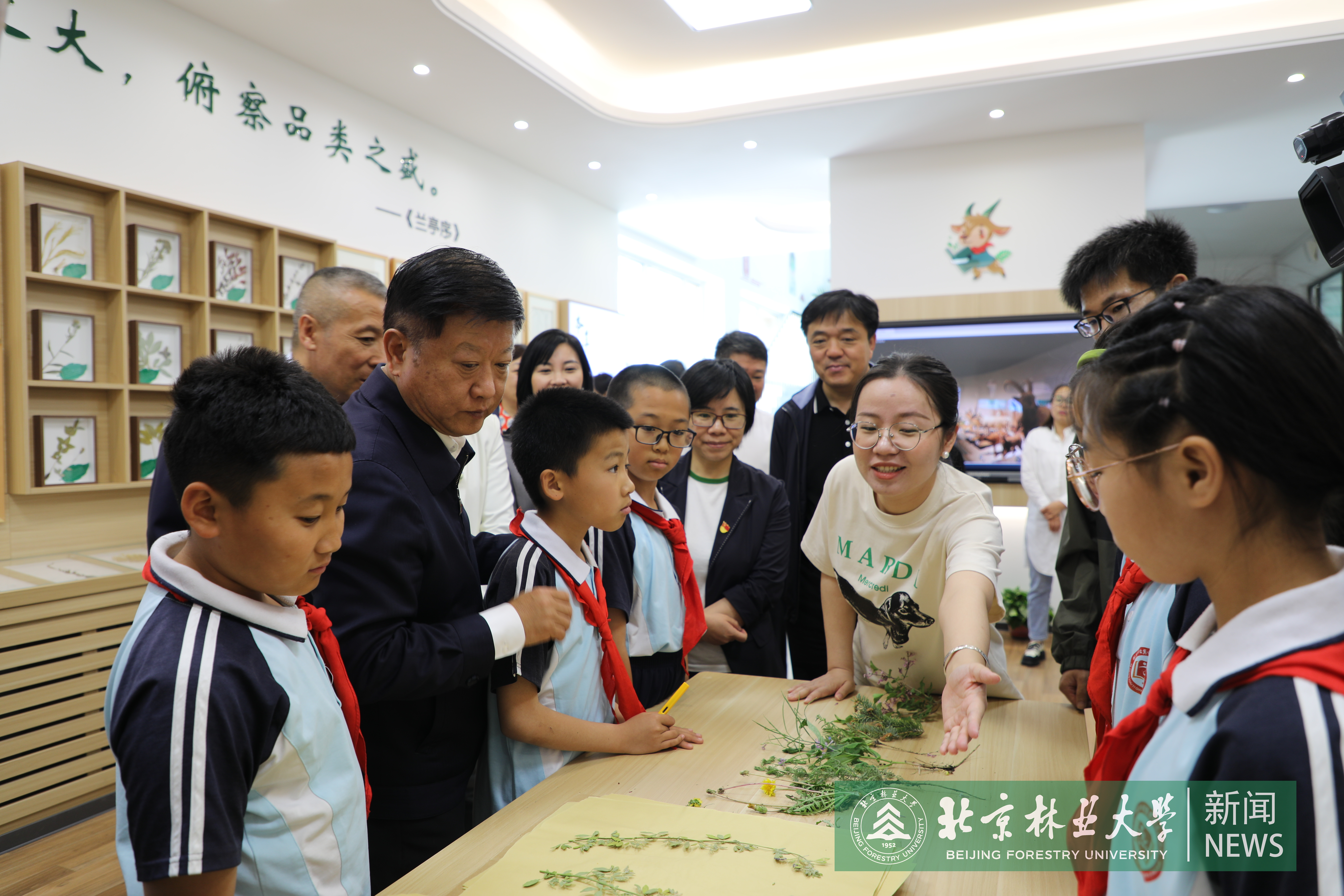 王洪元一行與科右前旗政府舉行工作座談會,共同推動2024年幫扶工作落地,并赴興安北京小學和“千萬工程”示范村柳樹川村進行實地調研。在興安北京小學,王洪元和劉海濤為“北京林業(yè)大學生態(tài)文明教育基地”揭牌,參觀由我校第五批教師支教團支持建設的北京林業(yè)大學教育幫扶科右前旗十年成果展、生態(tài)研學基地“興安本草堂”,參與學生植物標本制作課。王洪元表示,要充分發(fā)揮我校在宣傳闡釋習近平生態(tài)文明思想方面的多重優(yōu)勢,依托興安北京小學毗鄰城中草原的區(qū)位特點,高質量建設融通校內外的自然研學實踐基地,為當?shù)刂行W生更好接受生態(tài)文明實踐教育提供優(yōu)質平臺。