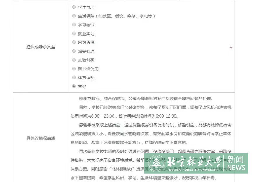 今年10月,就在“北林即時(shí)辦”平臺(tái)上線滿月之際,平臺(tái)后臺(tái)收到了一封真摯的感謝信。“感謝學(xué)校提供簡(jiǎn)單高效的平臺(tái),希望學(xué)生科研學(xué)習(xí)、生活環(huán)境越來(lái)越好!”這封信來(lái)自我校水保學(xué)院一位博士生同學(xué),他向平臺(tái)發(fā)來(lái)了有關(guān)寢室“噪音問(wèn)題”的訴求,令他沒(méi)有想到的是,這項(xiàng)困擾了他許久的問(wèn)題,竟通過(guò)“北林即時(shí)辦”平臺(tái)第一時(shí)間得到了解決。